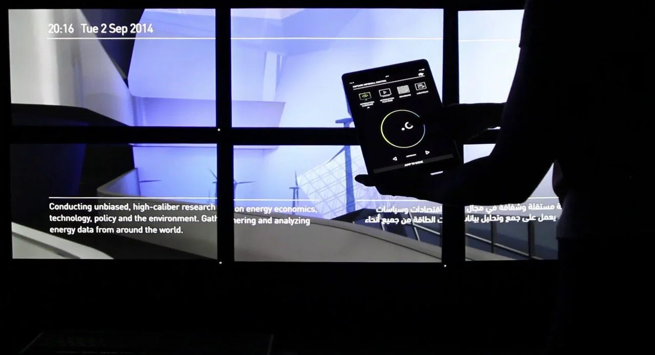 Opposite the main installation, the Info Wall serves as a dynamic information display for visitors. Content from social media websites and news sources is aggregated into a constantly evolving, multilingual dashboard. With a custom iPad app and CMS, staff can monitor, manage and update content at any moment.